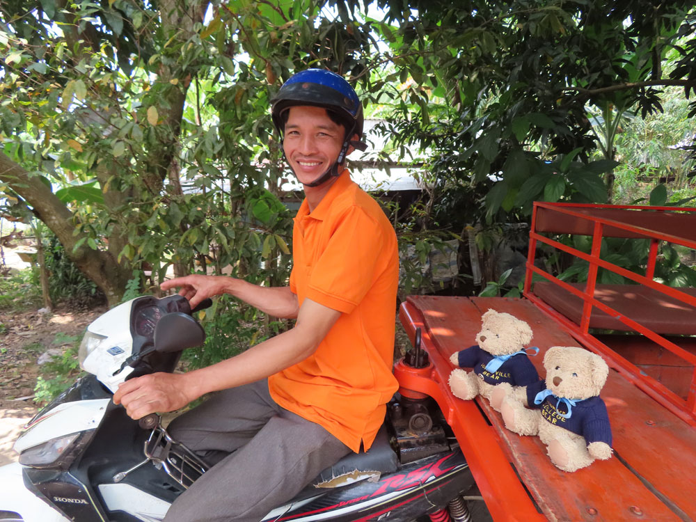 | We try our hand at basket weaving | Next excursion sees us on a tuc tuc .. | .. which took us over a river .. | .. to a passable creation of a French chateau |