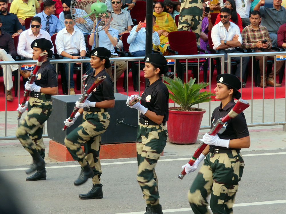 | And our final outing to the Pakistan Border at Wagah Gate .. | ..was really impressive. Fierce looking ladies twirled rifles.. | ..the two commanders looked bored. | ..then the main act arrived. |